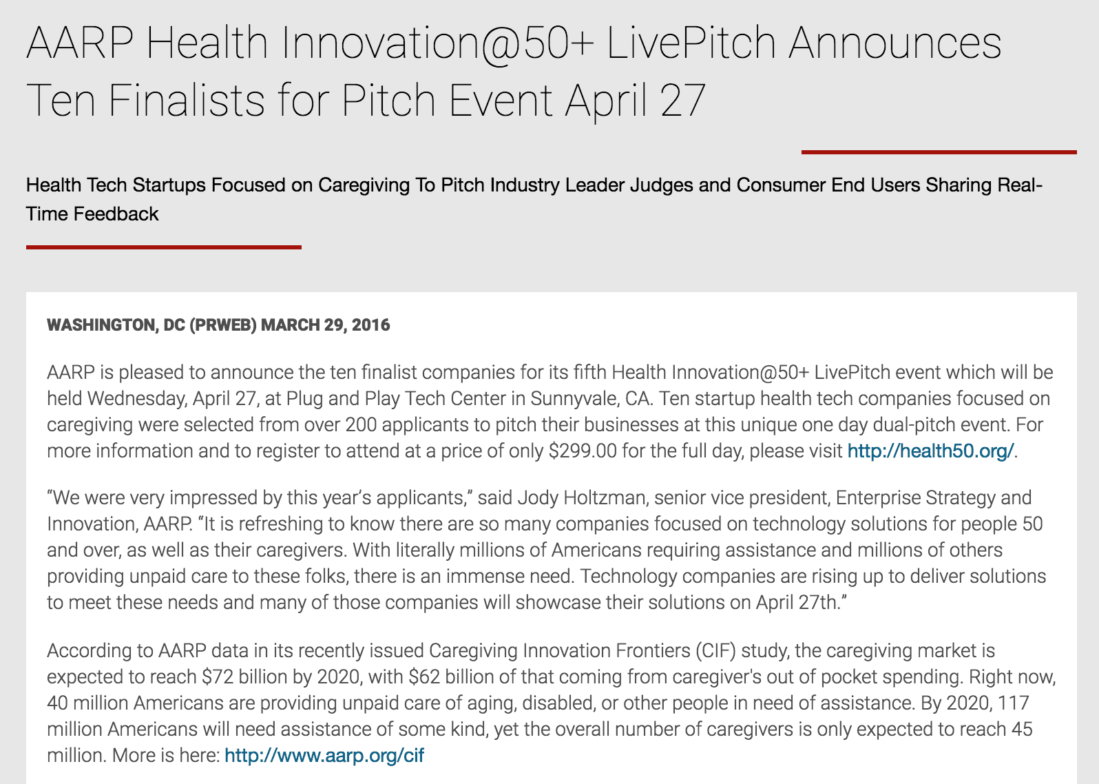 AARP is pleased to announce the ten finalist companies for its fifth Health Innovation@50+ LivePitch event which will be held Wednesday, April 27, at Plug and Play Tech Center in Sunnyvale, CA. Ten startup health tech companies focused on caregiving were selected from over 200 applicants to pitch their businesses at this unique one day dual-pitch event. For more information and to register to attend at a price of only $299.00 for the full day, please visit http://www.prweb.net/Redirect.aspx?id=aHR0cDovL2hlYWx0aDUwLm9yZy8=.