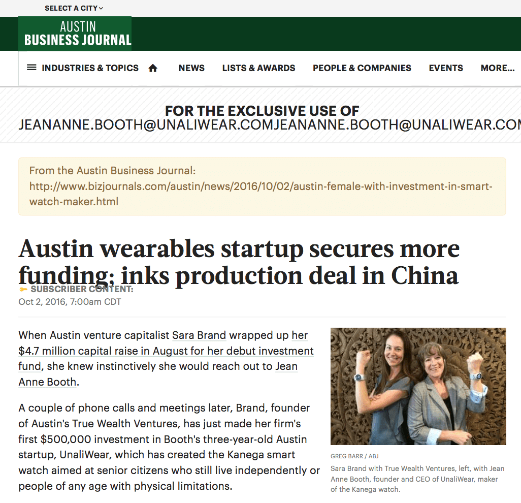 A couple of phone calls and meetings later, Brand, founder of Austin’s True Wealth Ventures, has just made her firm’s first $500,000 investment in Booth’s three-year-old Austin startup, UnaliWear, which has created the Kanega smart watch aimed at senior citizens who still live independently or people of any age with physical limitations.
